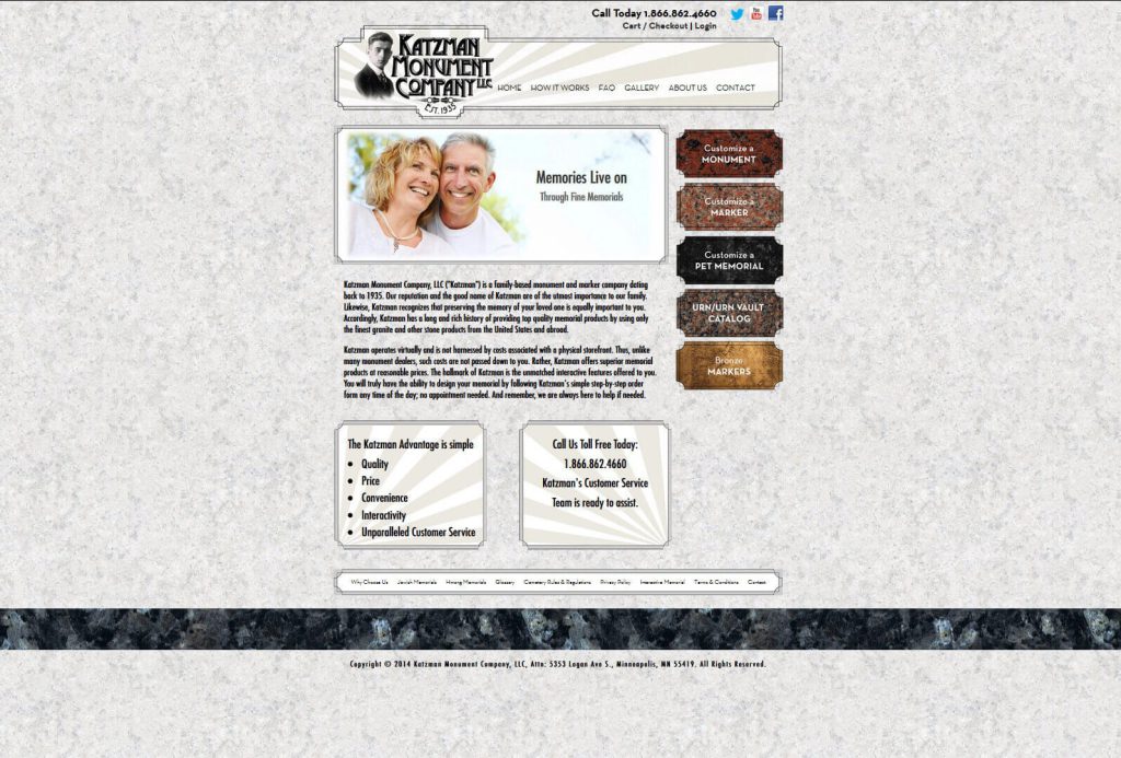 Katzman Monument Company, LLC (“Katzman”) is a family-based monument and marker company dating back to 1935. ThermoDynamo redesigned this Joomla powered e-commerce website using SEO paired with conversion optimization methodology to increase online orders. We also enhanced the e-commerce system with new products and improved content management.